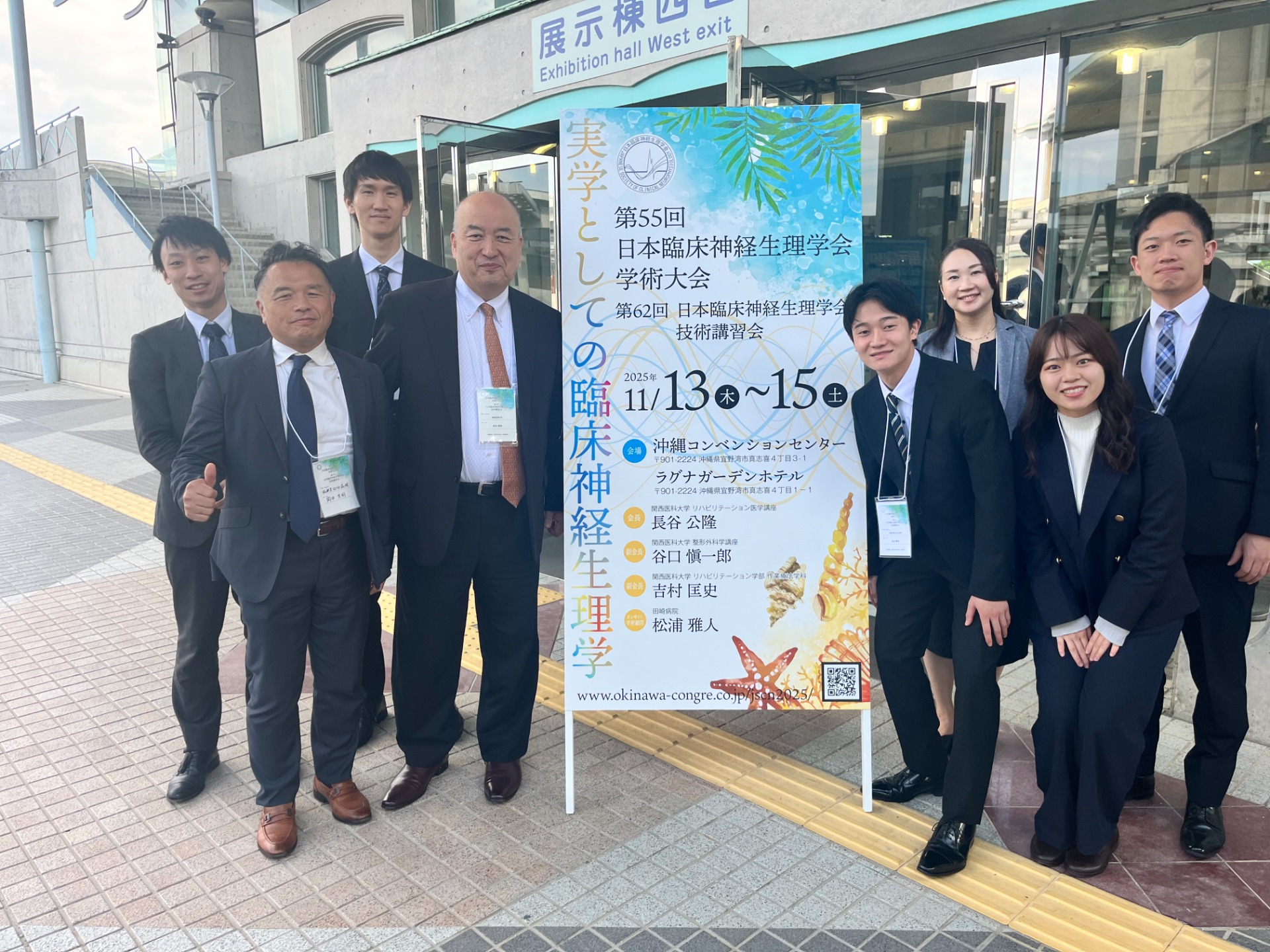 2025年11月13日から15日にかけて、第55回日本臨床神経生理学会学術大会が沖縄コンベンションセンターで開催されました。学術大会では、理学療法学科の東藤真理奈講師がシンポジストとして登壇し、福本悠樹講師に加えて、大学院生の桂木さんと中山さん、準研究員の黒部さんと長谷さんが一般演題の発表を行いました。さらに、副学長の鈴木俊明教授は教育講演にて講演を行いました。詳しくは下記をご参照ください。医師を中心とした学術大会で、理学療法士がしっかりと発表を行い活躍する姿は、後進にとっても非常に刺激になったと思います。【教育講演】